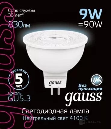 Elementary, цоколь - GU5.3, мощность - 9Вт, световой поток - 660Лм, цветовая температура - 4100К, не диммируется, 13529, Gauss