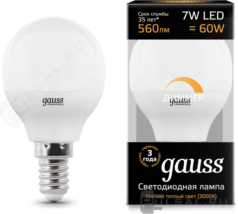 Black, цоколь - E14, мощность - 7Вт, световой поток - 560Лм, цветовая температура - 3000К, диммируется, 103101107-D, Gauss