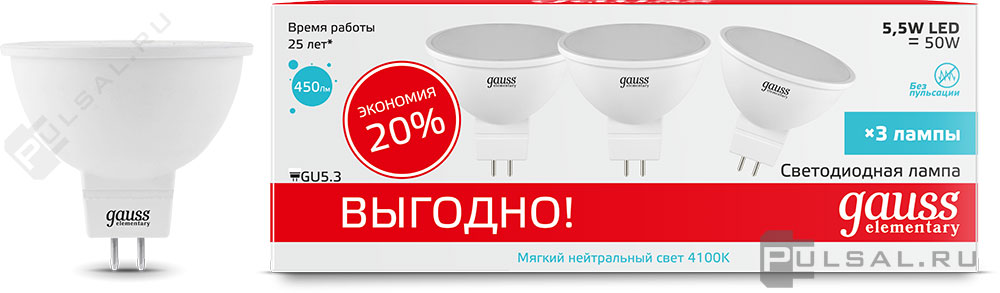 Elementary, цоколь - GU5.3, мощность - 7Вт, световой поток - 550Лм, цветовая температура - 4100К, не диммируется, 13527, Gauss