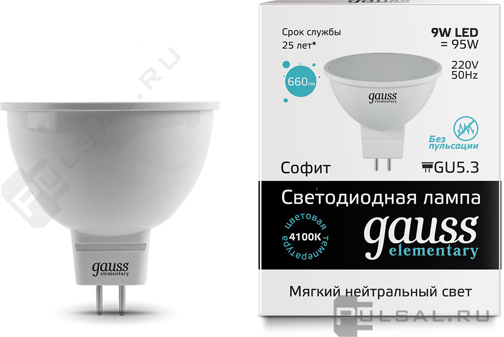 Elementary, цоколь - GU5.3, мощность - 11Вт, световой поток - 860Лм, цветовая температура - 4100К, не диммируется, 13521, Gauss