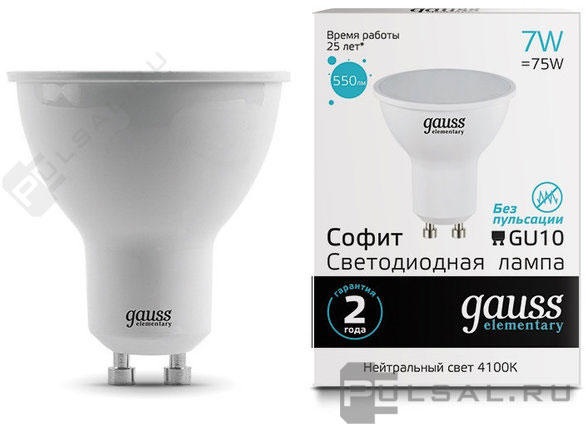 Elementary, цоколь - GU10, мощность - 5.5Вт, световой поток - 450Лм, цветовая температура - 4100К, не диммируется, 13626, Gauss