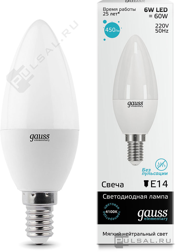Лампа светодиодная Elementary, цоколь - E14, мощность - 6Вт, световой поток - 450Лм, цветовая температура - 4100К, не диммируется, 33126, Gauss