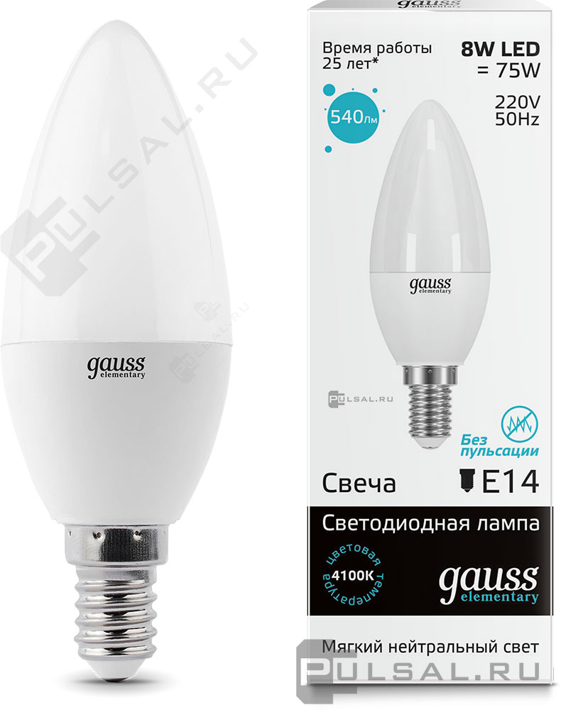 Elementary, цоколь - E14, мощность - 8Вт, световой поток - 540Лм, цветовая температура - 4100К, не диммируется, 34128, Gauss