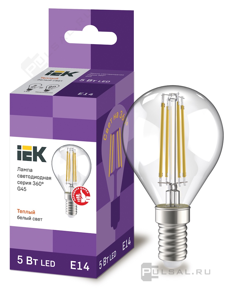 Лампа филаментная Лампы IEK, цоколь - E14, мощность - 5Вт, световой поток - 450Лм, цветовая температура - 3000К, не диммируется, LLF-G45-5-230-30-E14-CL, IEK