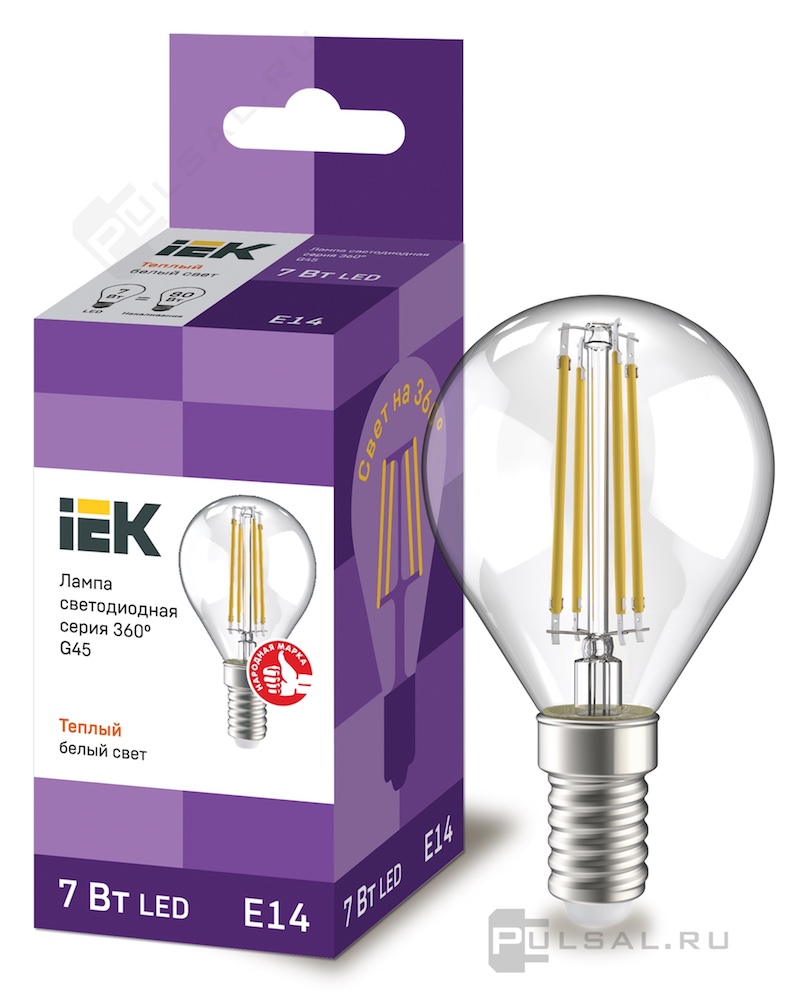 Лампа филаментная Лампы IEK, цоколь - E14, мощность - 7Вт, световой поток - 630Лм, цветовая температура - 3000К, не диммируется, LLF-G45-7-230-30-E14-CL, IEK