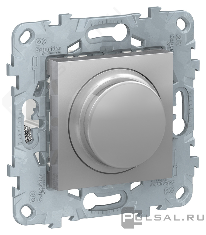Светорегулятор (диммер) 5-200 Вт, для LED 5-100 ВА Unica New Pure, Unica New Studio, поворотно-нажимной, с возможностью управления с 2-х мест, лампы накаливания и галогенные 220В (R), лампы с индукционным (обмоточным) трансформ.(L), лампы с электронным (емкостным) трансформ.(C), диммируемые лампы LED 220В (LEDi тип L), диммируемые лампы LED 220В (LEDi тип C), цвет - алюминий