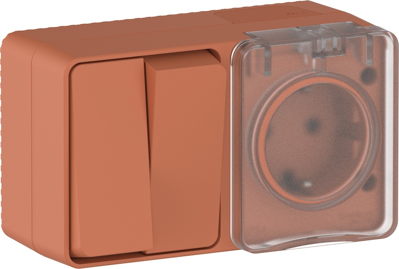 Блок, розетка + выключатель Atlas Design Profi 54, со шторками, с крышкой, с заземлением, одинарная, винтовые клеммы, цвет - терракотовый
