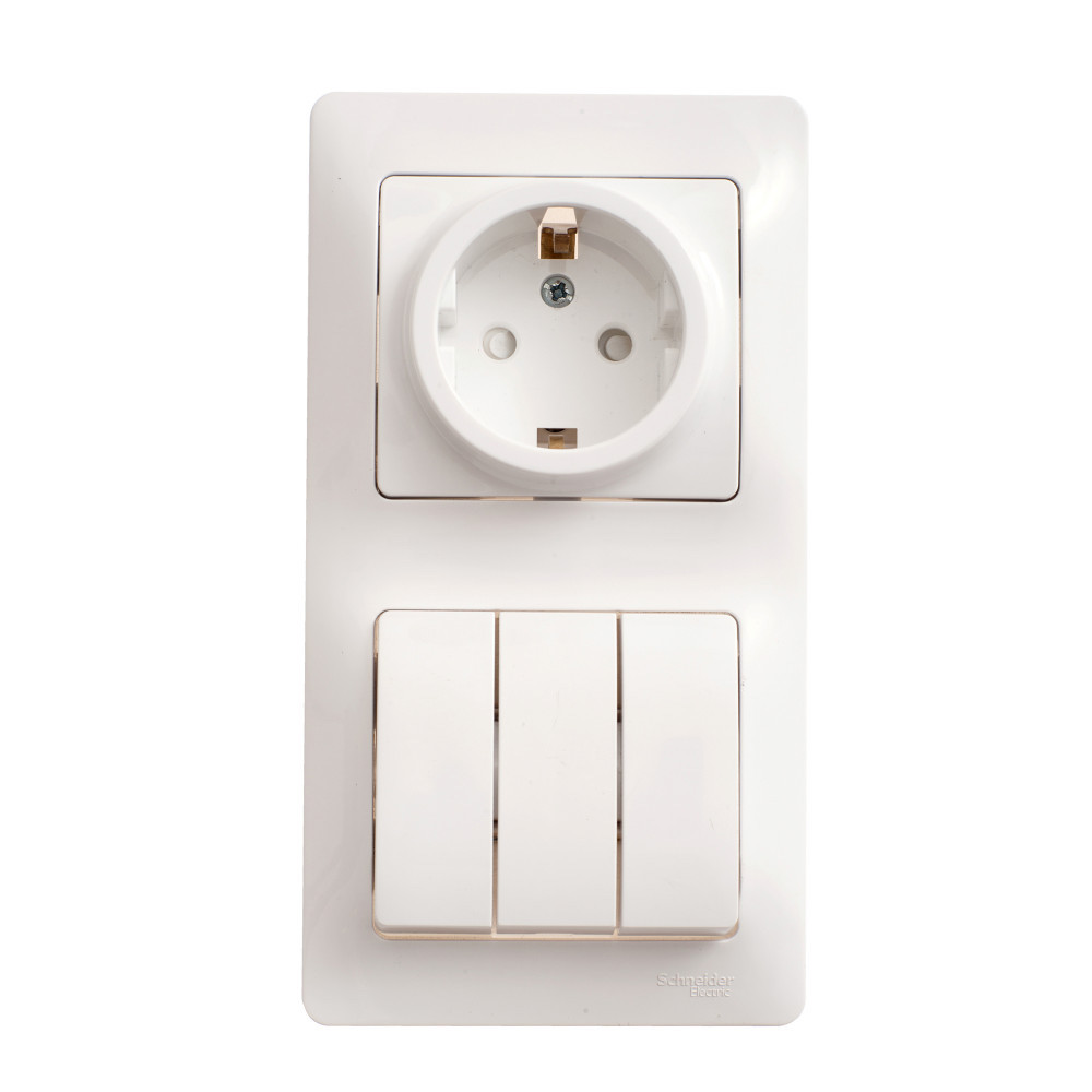 Блок розетка и 3-х клавишный выключатель с рамкой Glossa, без шторок, без заземления, одинарная, винтовые клеммы, цвет - белый