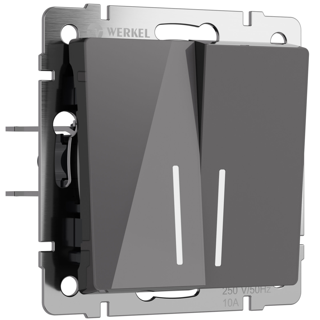 Выключатель Alumax, Split, Slab, Senso, Baguette, Acrylic, Platinum, Elite, Snabb, Stream, Flock, Stark, Fiore, Favorit, Diamant, Aluminium, Antik, Metallic, двухклавишный, с подсветкой, цвет - графит акрил