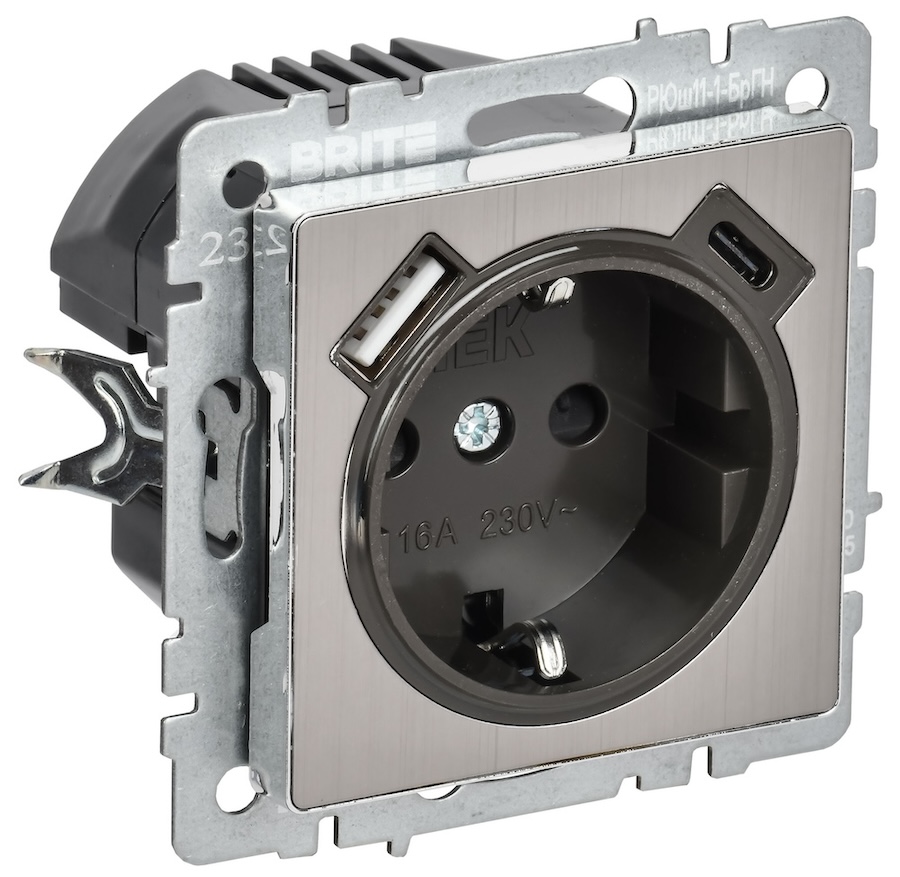 Розетка электрическая + USB А+С, быстрая, 18 Вт BRITE, USB type-C 5V, USB type-A 5V, двойная, цвет - никель
