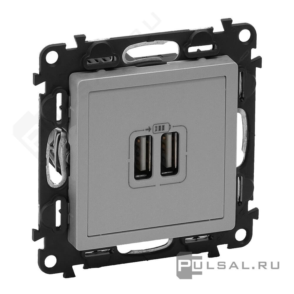 Розетка USB type-A, 1.5А Valena Life, USB type-A 5V, двойная, цвет - алюминий