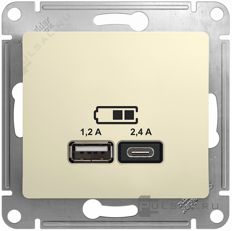 Розетка USB type-C + type-A, 2.4А Glossa, USB type-C 5V, USB type-A 5V, двойная, цвет - бежевый